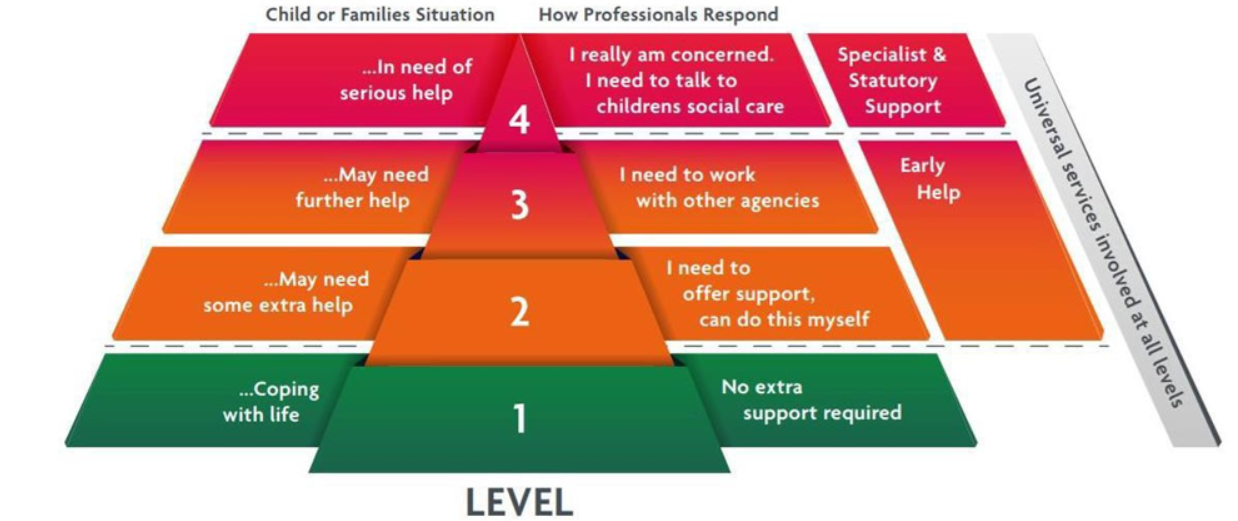 The diagram below shows how family situations and professional responses differ across a range of levels. We use this graduated approach to make sure we can provide the best support for different families’ individual situations.